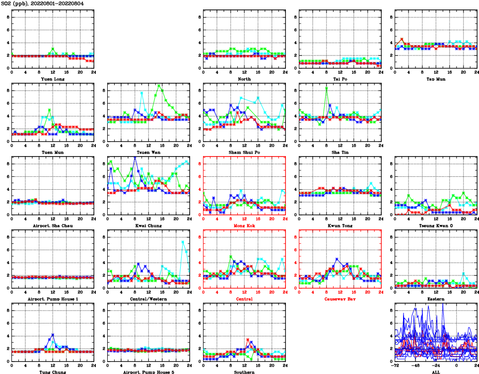 | Air Quality Data Time Series for SO2 (2022/08/04) | ( Line colors: Day -3 Day -2 Day -1 Current day ) | 2D Map Current AQHI |