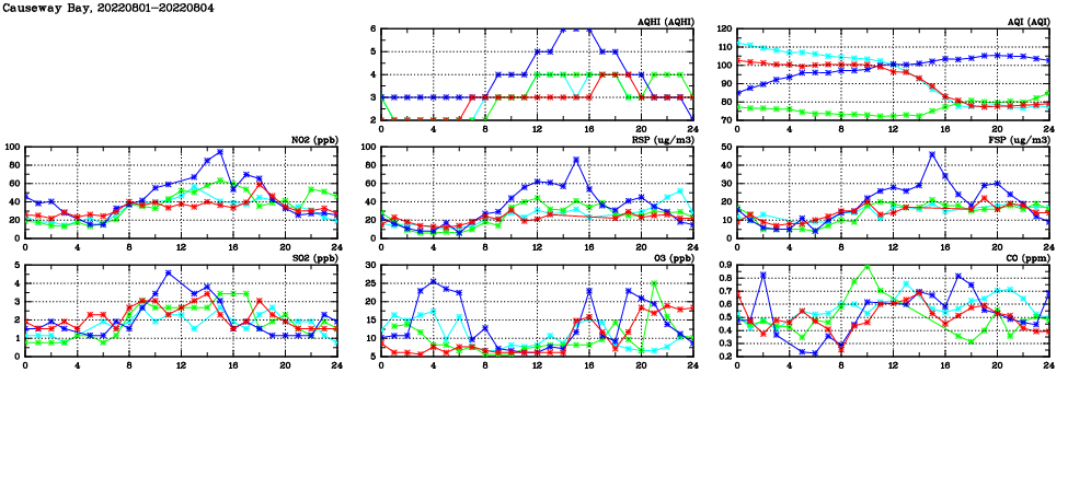 | Air Quality Data Time Series in Causeway Bay (2022/08/04) | ( Line colors: Day -3 Day -2 Day -1 Current day ) | 2D Map Current AQHI |