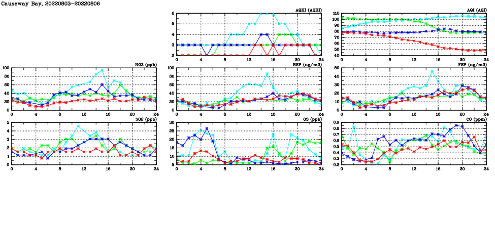 | Air Quality Data Time Series in Causeway Bay (2022/08/06) | ( Line colors: Day -3 Day -2 Day -1 Current day ) | 2D Map Current AQHI |
