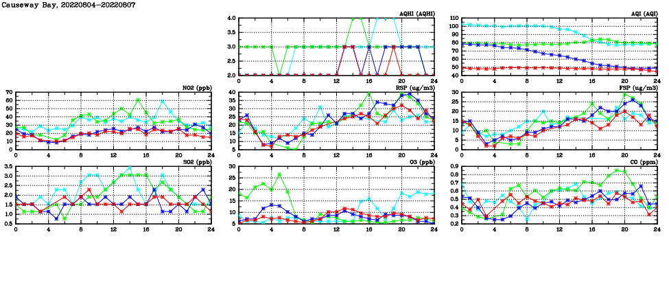 | Air Quality Data Time Series in Causeway Bay (2022/08/07) | ( Line colors: Day -3 Day -2 Day -1 Current day ) | 2D Map Current AQHI |