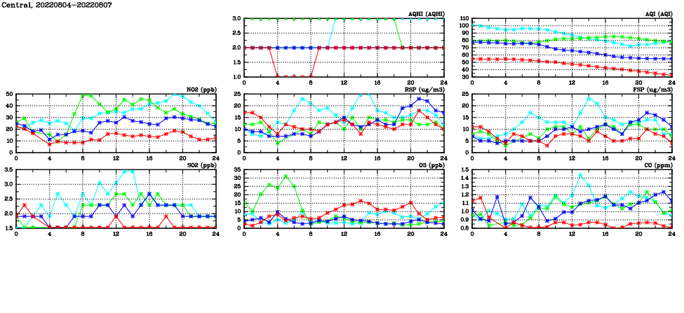 | Air Quality Data Time Series in Central (2022/08/07) | ( Line colors: Day -3 Day -2 Day -1 Current day ) | 2D Map Current AQHI |