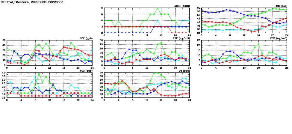 | Air Quality Data Time Series in Central/Western (2022/08/05) | ( Line colors: Day -3 Day -2 Day -1 Current day ) | 2D Map Current AQHI |