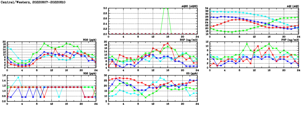 | Air Quality Data Time Series in Central/Western (2022/08/10) | ( Line colors: Day -3 Day -2 Day -1 Current day ) | 2D Map Current AQHI |