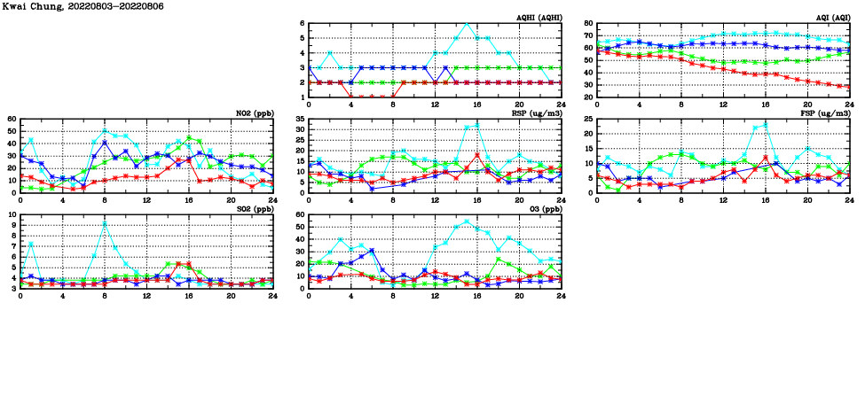 | Air Quality Data Time Series in Kwai Chung (2022/08/06) | ( Line colors: Day -3 Day -2 Day -1 Current day ) | 2D Map Current AQHI |