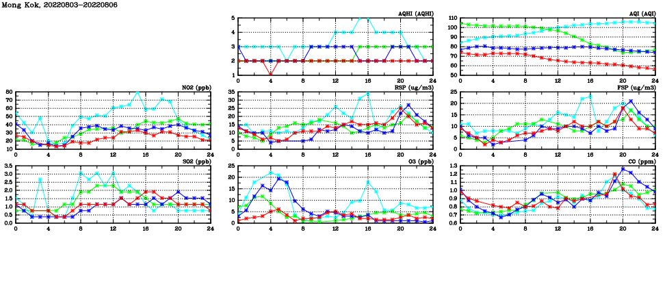| Air Quality Data Time Series in Mong Kok (2022/08/06) | ( Line colors: Day -3 Day -2 Day -1 Current day ) | 2D Map Current AQHI |