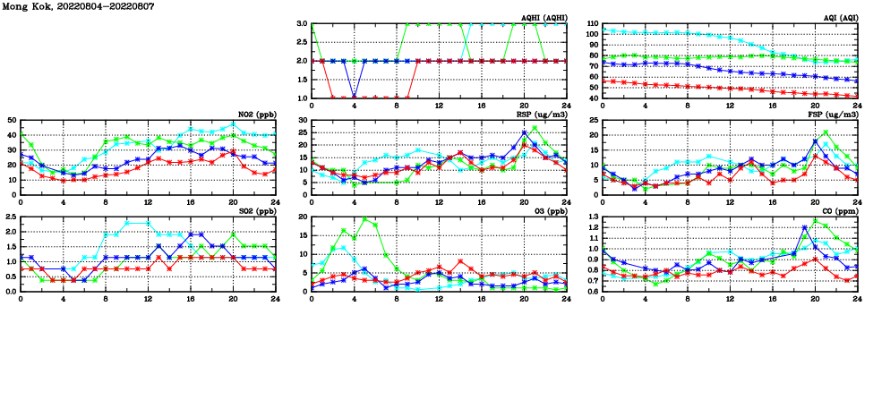 | Air Quality Data Time Series in Mong Kok (2022/08/07) | ( Line colors: Day -3 Day -2 Day -1 Current day ) | 2D Map Current AQHI |