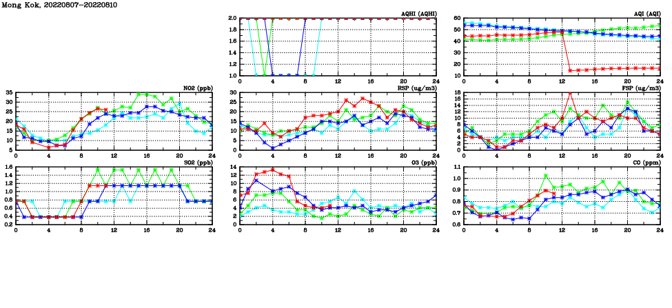 | Air Quality Data Time Series in Mong Kok (2022/08/10) | ( Line colors: Day -3 Day -2 Day -1 Current day ) | 2D Map Current AQHI |
