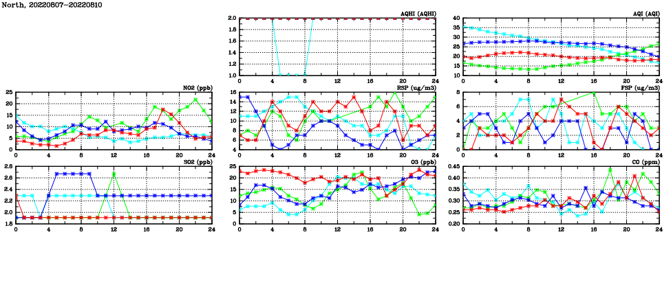 | Air Quality Data Time Series in North (2022/08/10) | ( Line colors: Day -3 Day -2 Day -1 Current day ) | 2D Map Current AQHI |