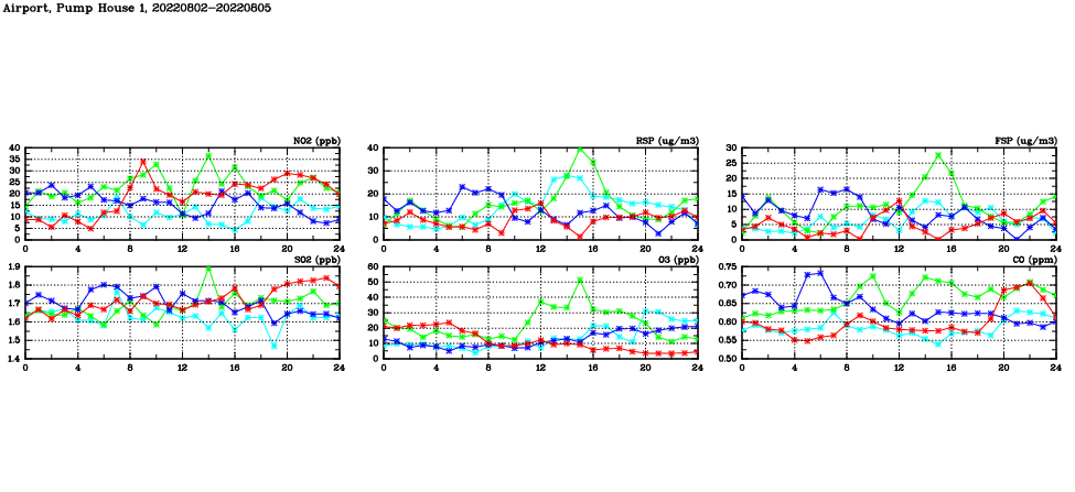 | Air Quality Data Time Series in Airport, Pump House 1 (2022/08/05) | ( Line colors: Day -3 Day -2 Day -1 Current day ) | 2D Map Current AQHI |