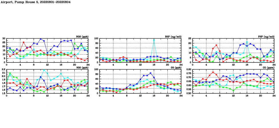 | Air Quality Data Time Series in Airport, Pump House 5 (2022/08/04) | ( Line colors: Day -3 Day -2 Day -1 Current day ) | 2D Map Current AQHI |