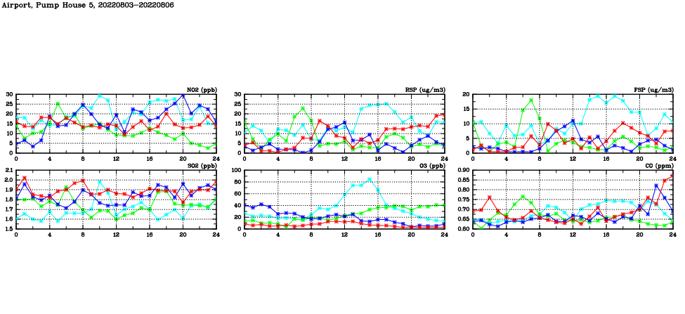 | Air Quality Data Time Series in Airport, Pump House 5 (2022/08/06) | ( Line colors: Day -3 Day -2 Day -1 Current day ) | 2D Map Current AQHI |