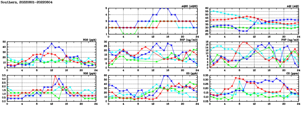 | Air Quality Data Time Series in Southern (2022/08/04) | ( Line colors: Day -3 Day -2 Day -1 Current day ) | 2D Map Current AQHI |
