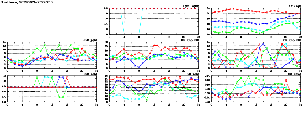 | Air Quality Data Time Series in Southern (2022/08/10) | ( Line colors: Day -3 Day -2 Day -1 Current day ) | 2D Map Current AQHI |