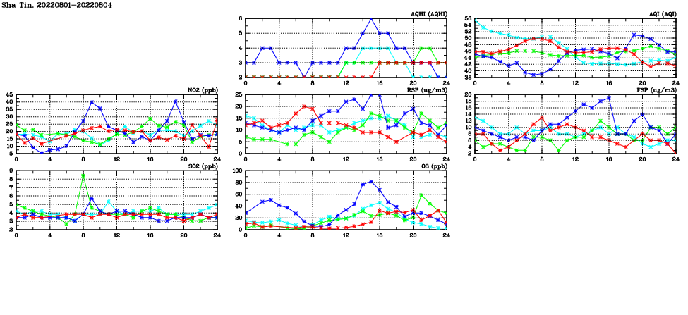 | Air Quality Data Time Series in Sha Tin (2022/08/04) | ( Line colors: Day -3 Day -2 Day -1 Current day ) | 2D Map Current AQHI |