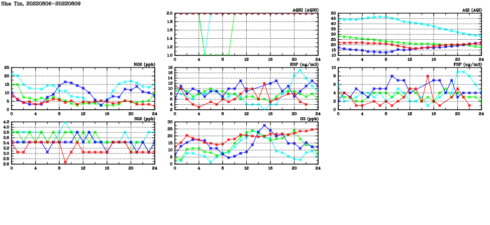 | Air Quality Data Time Series in Sha Tin (2022/08/09) | ( Line colors: Day -3 Day -2 Day -1 Current day ) | 2D Map Current AQHI |
