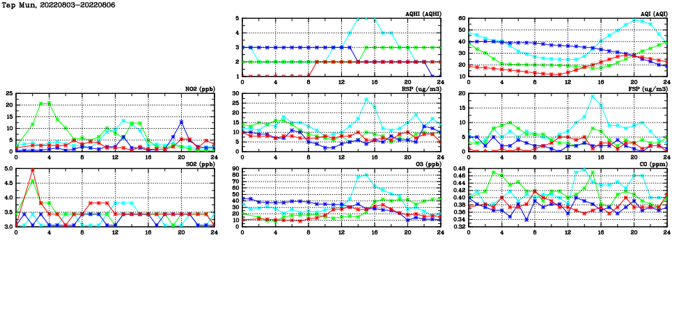 | Air Quality Data Time Series in Tap Mun (2022/08/06) | ( Line colors: Day -3 Day -2 Day -1 Current day ) | 2D Map Current AQHI |
