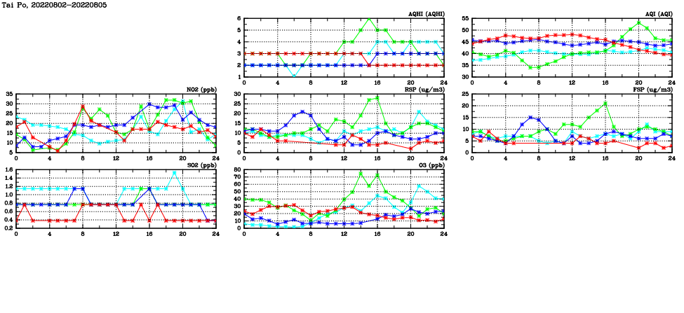 | Air Quality Data Time Series in Tai Po (2022/08/05) | ( Line colors: Day -3 Day -2 Day -1 Current day ) | 2D Map Current AQHI |