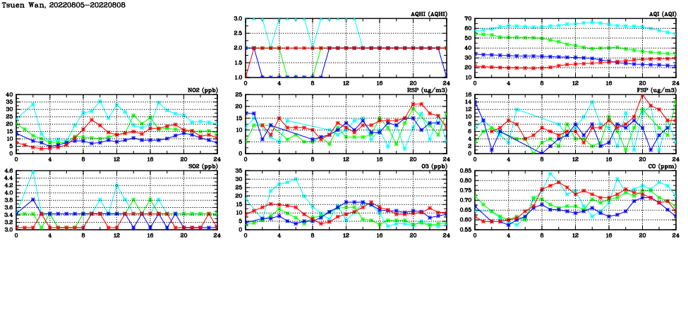 | Air Quality Data Time Series in Tsuen Wan (2022/08/08) | ( Line colors: Day -3 Day -2 Day -1 Current day ) | 2D Map Current AQHI |