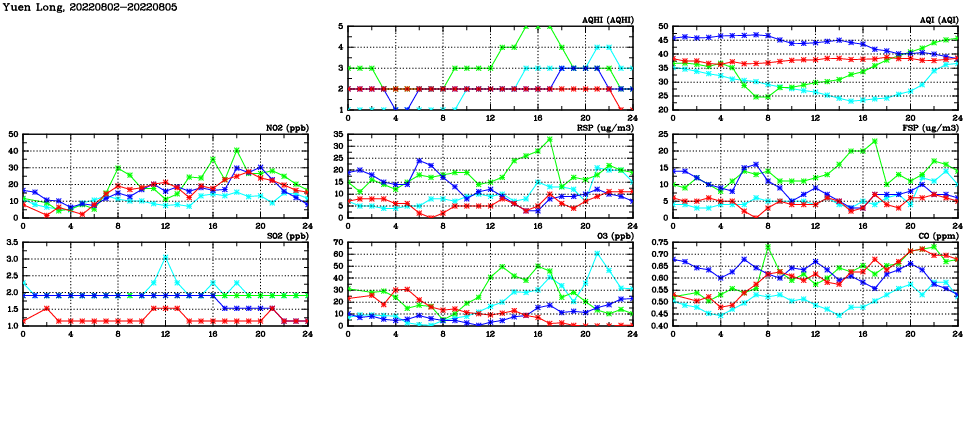 | Air Quality Data Time Series in Yuen Long (2022/08/05) | ( Line colors: Day -3 Day -2 Day -1 Current day ) | 2D Map Current AQHI |
