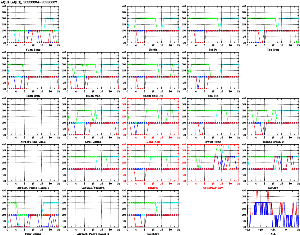 | Air Quality Data Time Series for AQHI (2022/08/07) | ( Line colors: Day -3 Day -2 Day -1 Current day ) | 2D Map Current AQHI |