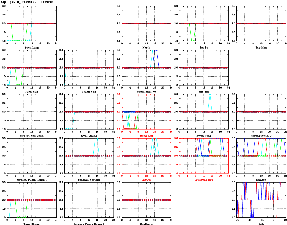 | Air Quality Data Time Series for AQHI (2022/08/11) | ( Line colors: Day -3 Day -2 Day -1 Current day ) | 2D Map Current AQHI |