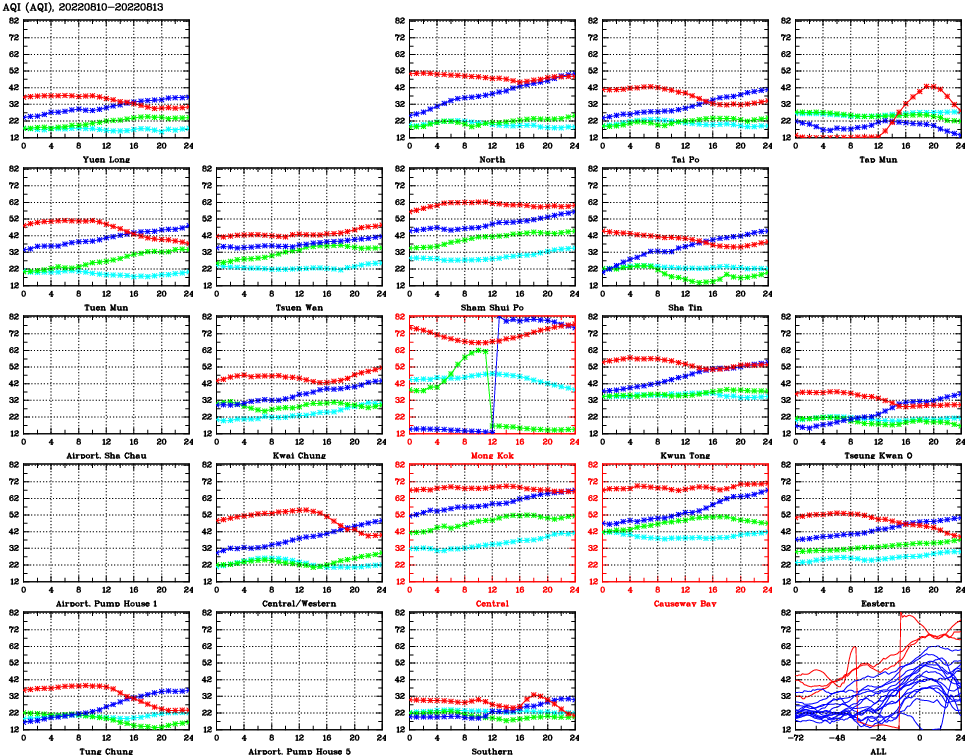 | Air Quality Data Time Series for AQI (2022/08/13) | ( Line colors: Day -3 Day -2 Day -1 Current day ) | 2D Map Current AQHI |