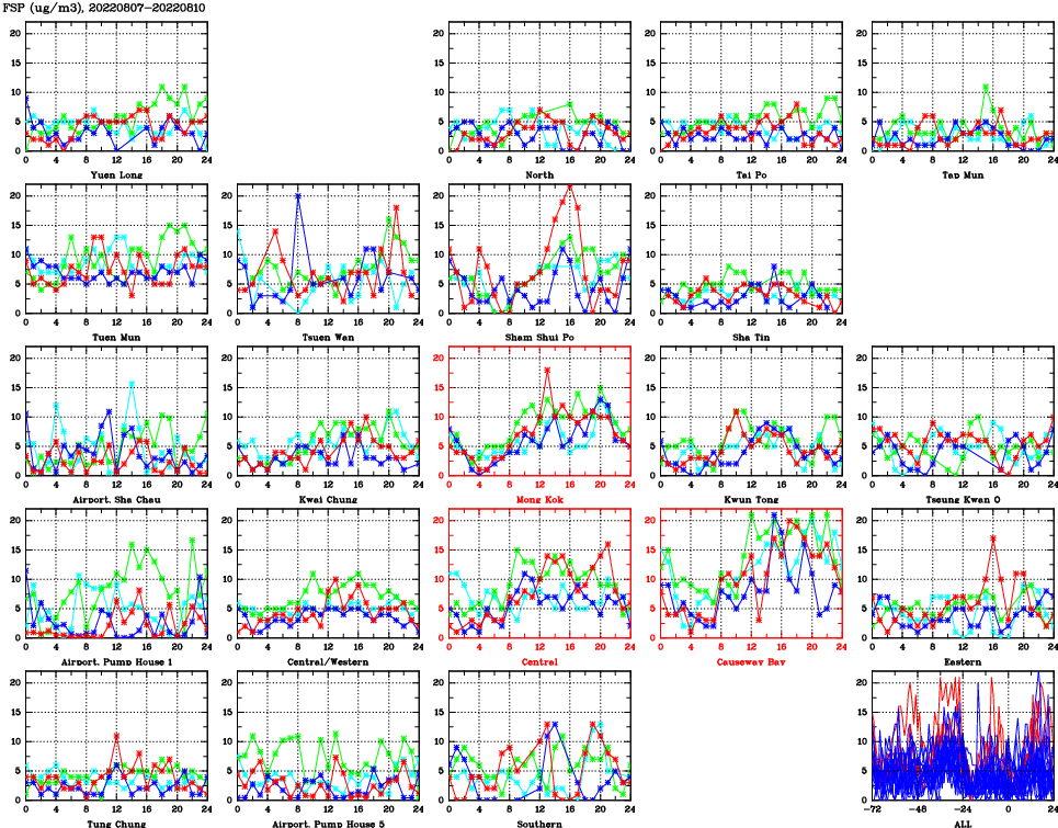 | Air Quality Data Time Series for FSP (2022/08/10) | ( Line colors: Day -3 Day -2 Day -1 Current day ) | 2D Map Current AQHI |
