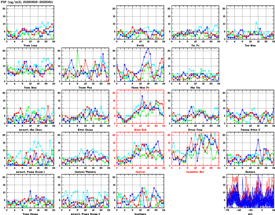 | Air Quality Data Time Series for FSP (2022/08/11) | ( Line colors: Day -3 Day -2 Day -1 Current day ) | 2D Map Current AQHI |