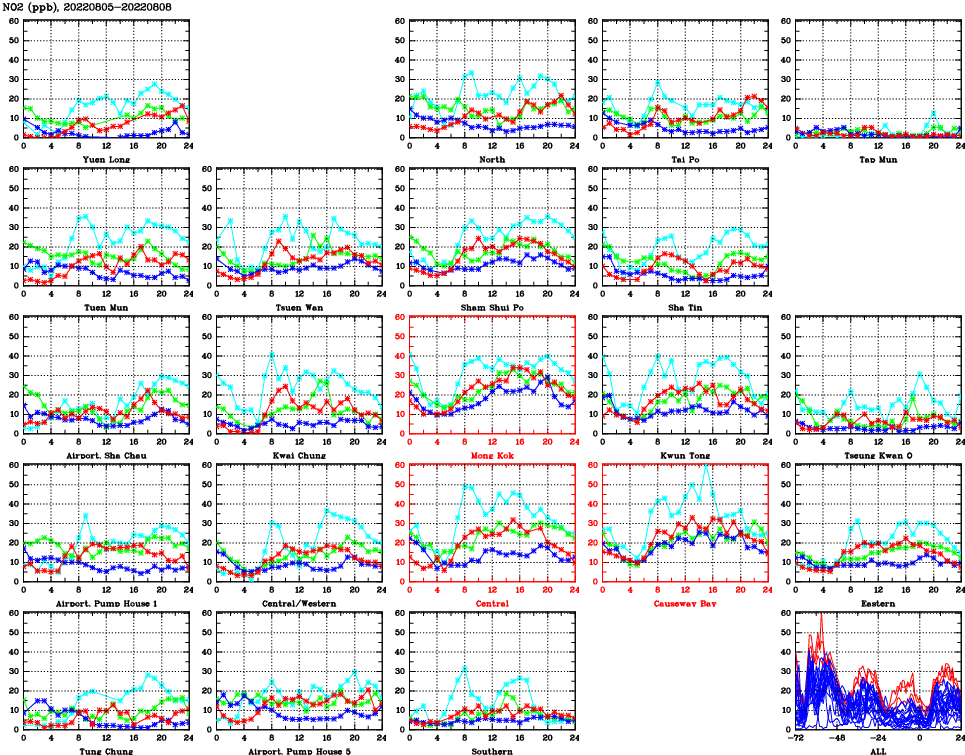 | Air Quality Data Time Series for NO2 (2022/08/08) | ( Line colors: Day -3 Day -2 Day -1 Current day ) | 2D Map Current AQHI |