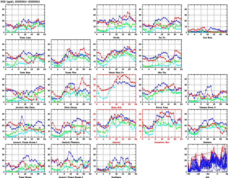 | Air Quality Data Time Series for NO2 (2022/08/13) | ( Line colors: Day -3 Day -2 Day -1 Current day ) | 2D Map Current AQHI |