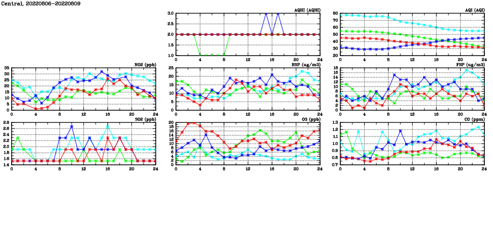 | Air Quality Data Time Series in Central (2022/08/09) | ( Line colors: Day -3 Day -2 Day -1 Current day ) | 2D Map Current AQHI |
