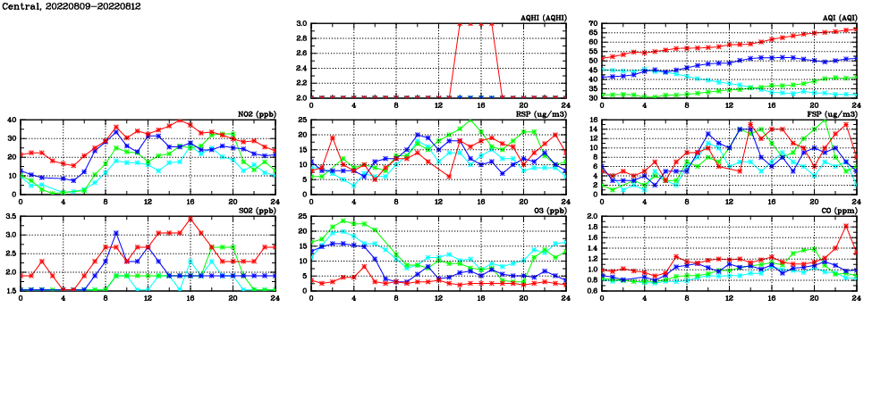 | Air Quality Data Time Series in Central (2022/08/12) | ( Line colors: Day -3 Day -2 Day -1 Current day ) | 2D Map Current AQHI |