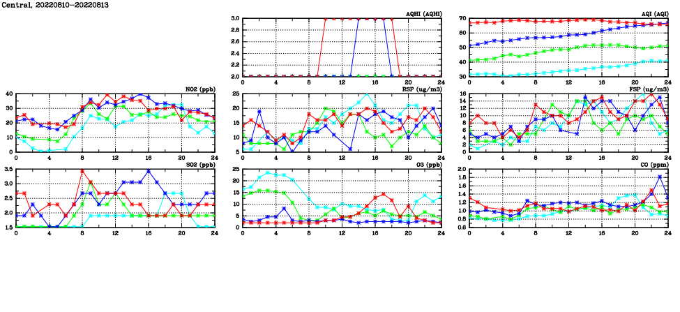 | Air Quality Data Time Series in Central (2022/08/13) | ( Line colors: Day -3 Day -2 Day -1 Current day ) | 2D Map Current AQHI |