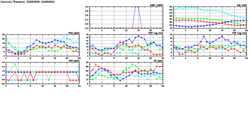 | Air Quality Data Time Series in Central/Western (2022/08/09) | ( Line colors: Day -3 Day -2 Day -1 Current day ) | 2D Map Current AQHI |