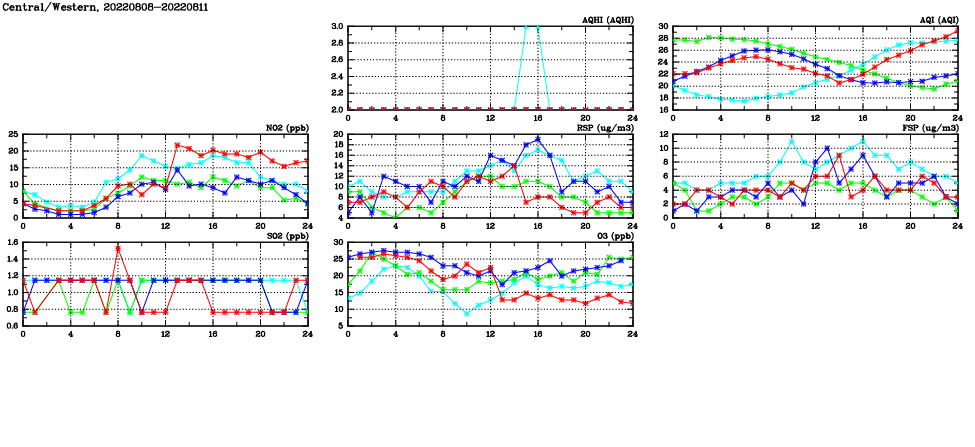 | Air Quality Data Time Series in Central/Western (2022/08/11) | ( Line colors: Day -3 Day -2 Day -1 Current day ) | 2D Map Current AQHI |