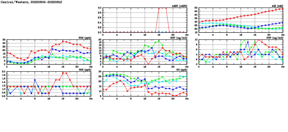 | Air Quality Data Time Series in Central/Western (2022/08/12) | ( Line colors: Day -3 Day -2 Day -1 Current day ) | 2D Map Current AQHI |