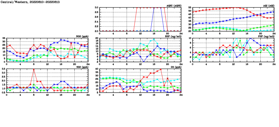 Air Quality Data Time Series in Central/Western (2022/08/13) ( Line colors: Day -3 Day -2 Day -1 Current day ) 2D Map   Current AQHI