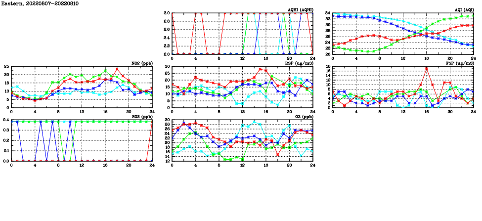 | Air Quality Data Time Series in Eastern (2022/08/10) | ( Line colors: Day -3 Day -2 Day -1 Current day ) | 2D Map Current AQHI |
