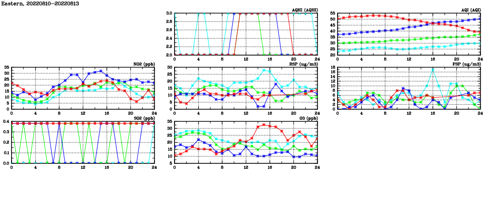 | Air Quality Data Time Series in Eastern (2022/08/13) | ( Line colors: Day -3 Day -2 Day -1 Current day ) | 2D Map Current AQHI |