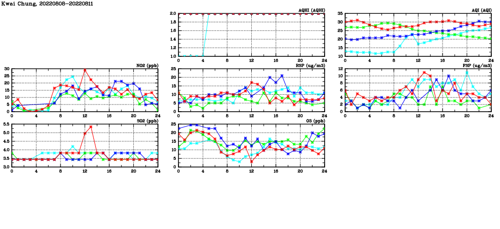 | Air Quality Data Time Series in Kwai Chung (2022/08/11) | ( Line colors: Day -3 Day -2 Day -1 Current day ) | 2D Map Current AQHI |