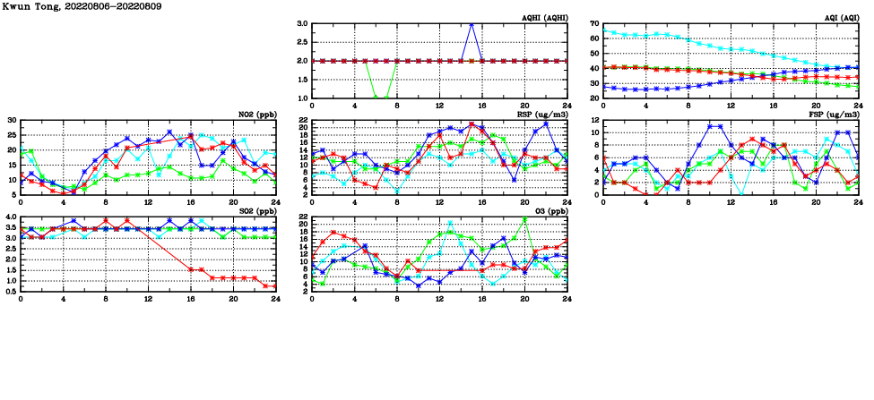 | Air Quality Data Time Series in Kwun Tong (2022/08/09) | ( Line colors: Day -3 Day -2 Day -1 Current day ) | 2D Map Current AQHI |