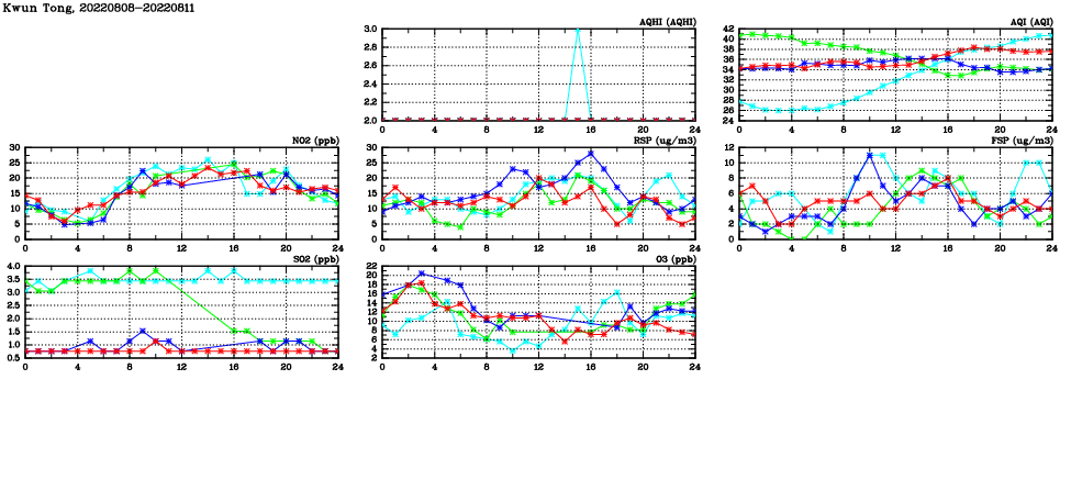 | Air Quality Data Time Series in Kwun Tong (2022/08/11) | ( Line colors: Day -3 Day -2 Day -1 Current day ) | 2D Map Current AQHI |