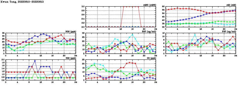| Air Quality Data Time Series in Kwun Tong (2022/08/13) | ( Line colors: Day -3 Day -2 Day -1 Current day ) | 2D Map Current AQHI |