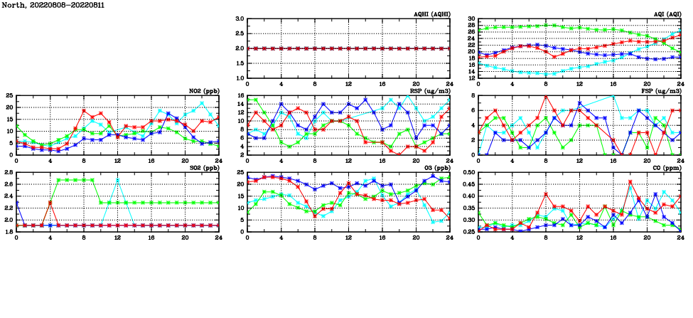 | Air Quality Data Time Series in North (2022/08/11) | ( Line colors: Day -3 Day -2 Day -1 Current day ) | 2D Map Current AQHI |