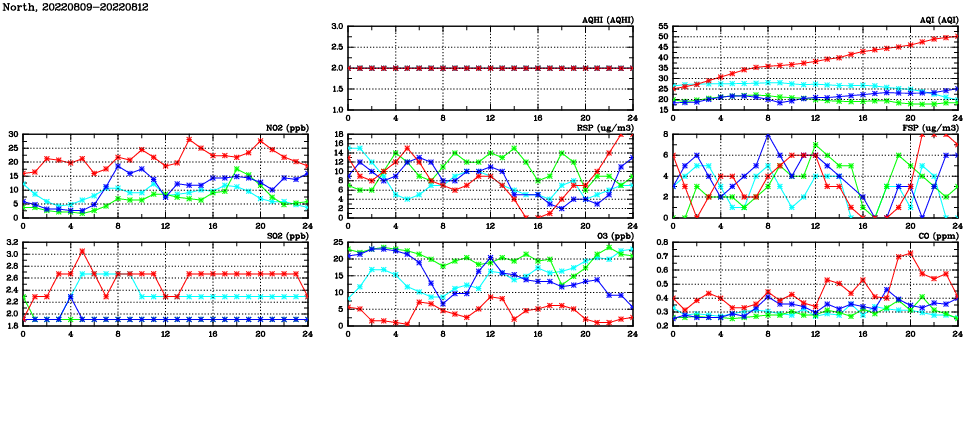 | Air Quality Data Time Series in North (2022/08/12) | ( Line colors: Day -3 Day -2 Day -1 Current day ) | 2D Map Current AQHI |