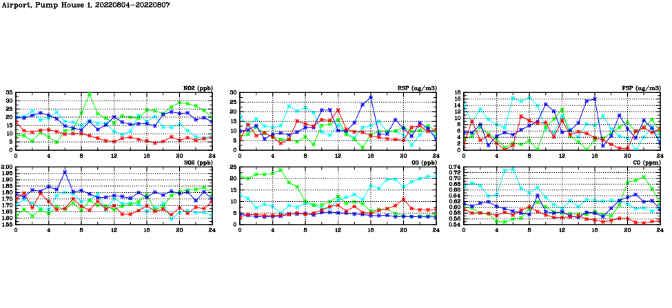 | Air Quality Data Time Series in Airport, Pump House 1 (2022/08/07) | ( Line colors: Day -3 Day -2 Day -1 Current day ) | 2D Map Current AQHI |