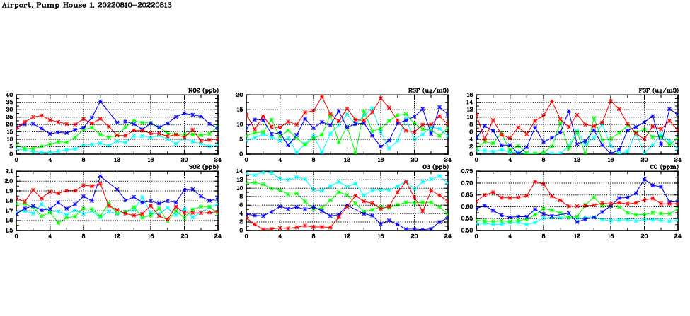 | Air Quality Data Time Series in Airport, Pump House 1 (2022/08/13) | ( Line colors: Day -3 Day -2 Day -1 Current day ) | 2D Map Current AQHI |
