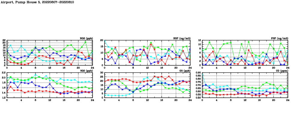 | Air Quality Data Time Series in Airport, Pump House 5 (2022/08/10) | ( Line colors: Day -3 Day -2 Day -1 Current day ) | 2D Map Current AQHI |