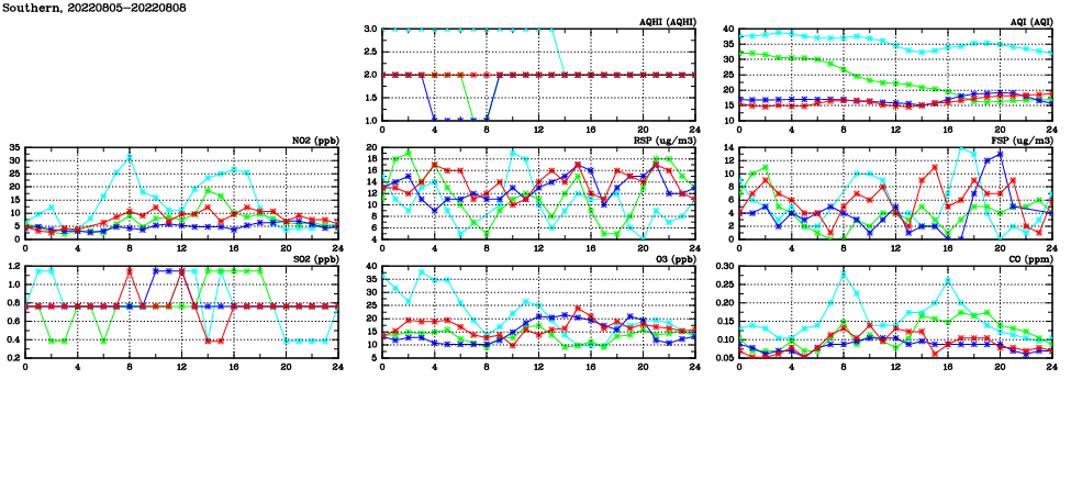 | Air Quality Data Time Series in Southern (2022/08/08) | ( Line colors: Day -3 Day -2 Day -1 Current day ) | 2D Map Current AQHI |