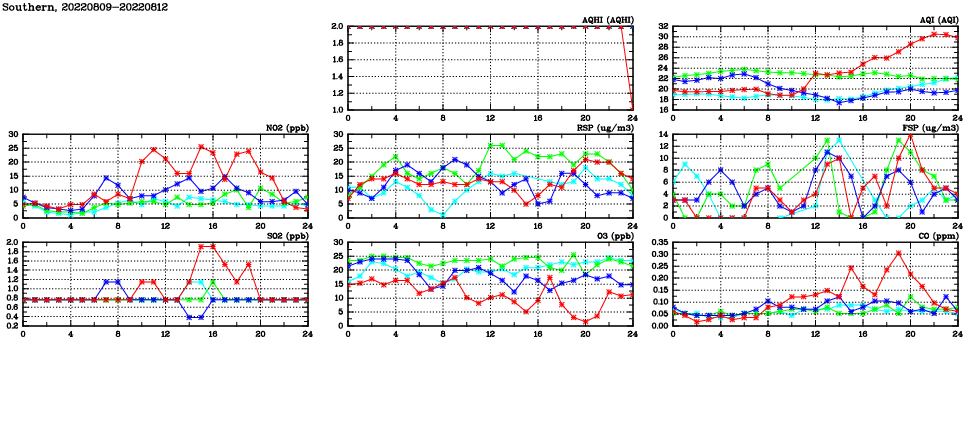 | Air Quality Data Time Series in Southern (2022/08/12) | ( Line colors: Day -3 Day -2 Day -1 Current day ) | 2D Map Current AQHI |